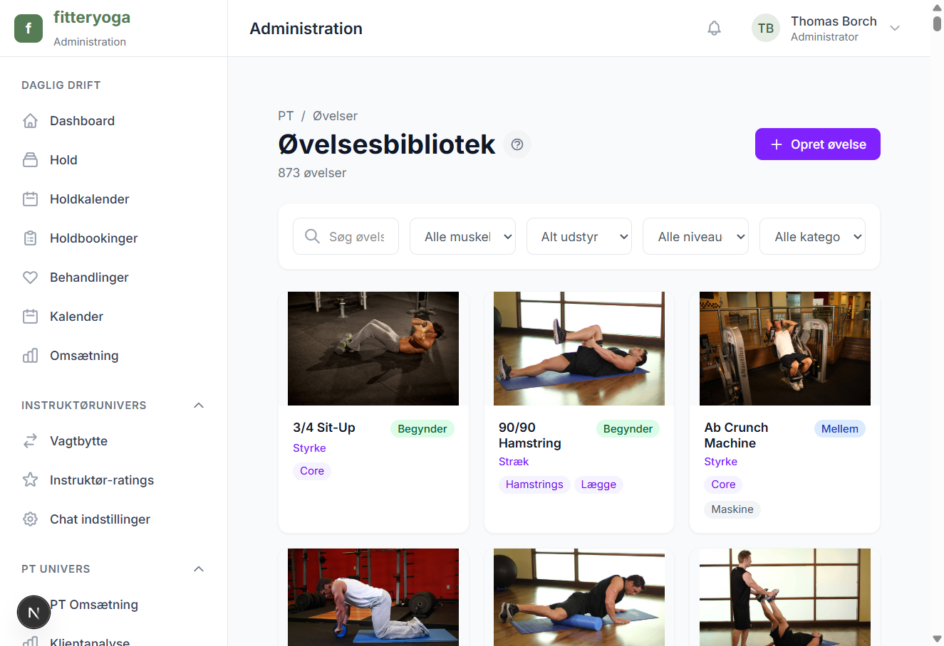 Alt hvad dine personlige trænere behøver — kalenderbooking, sessionspakker, klienthåndtering, træningsprogrammer og over 800 øvelser med animationer.