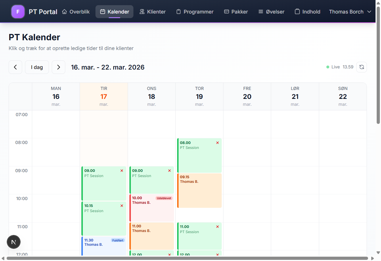 Ugeoverblik med sessioner, klientbookinger og ledige tider